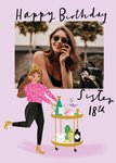 This Scribbler greeting card has a light purple background with an illustrated woman pushing a drinks trolley, and a central rectangular photo upload area above her.