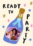 This Scribbler greeting card has a cream background with colourful star shapes, featuring an illustrated champagne bottle with a ribbon and a cut-out photo upload area on the label.