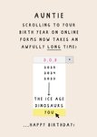 Featuring a message about how scrolling to the aunt's birth year on online forms takes a long time, implying that the aunt is older. The card includes a dropdown menu.