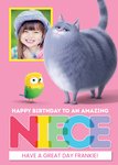 Features Secret Life Of Pets character and photo upload area.Text reads "Happy birthday to an amazing Niece Have a great day Frankie!".