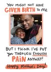 Front of card: Typographic design with pgoto upload in centre Text reads:"You might not have given birth to me but I think I've put you through enough pain anyway! Happy Mother's Day!" With photo upload option.