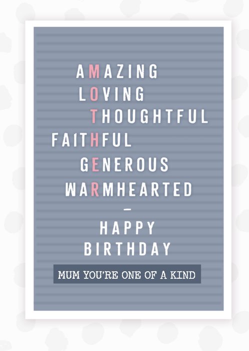 A sweet and sentimental Birthday featuring illustrated letter board, the letters of the word line up so that they highlight and spell out 'Mother' in pink.
