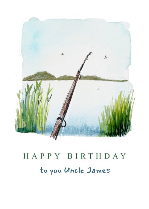 Set The Scene square watercolour painting sitting in the centre of the card. The painting is of a fishing rod ovelooking a tranquil lake. The non editable caption reads Happy Birthday followed by the editable To You Recipient's name. The card background colour is white.