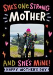 A bold and empowering Mother’s Day card celebrating a strong mum, featuring vibrant typography, fun doodle accents, and a large landscape-shaped photo upload area on a black background.