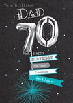 Front of card: Dad's 70th Birthday Card Silver number 70 balloon with banners surrounded by stars on a black textured background. Text reads: "To a brilliant Dad 70 happy Birthday to you! Love from Kev & Julie x". 'Love from Kev & Julie x' can be personalised!