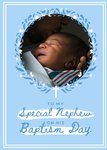 Front of card: Illustrated Wreath photo frame in centre of card on a blue background with text below. Text reads: To my Special Nephew on his Baptism Day. Editable text.