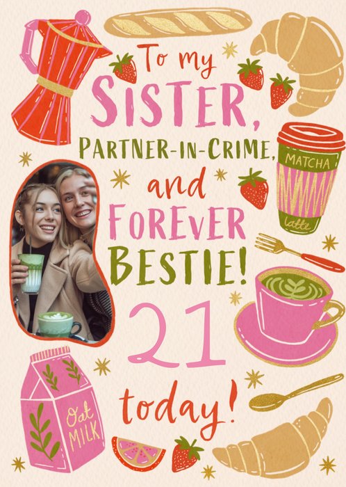 Featuring a fun, colourful typographic design in the centre of the card. Around the edge are illustrations of croissants, bread, strawberries, matcha, coffee and oat milk. On the left hand side is a photo upload with a wiggly, red border.
