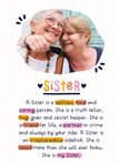 "Sister. A Sister is a selfless, kind and caring person. She is a truth teller, hug giver and secret keeper. She is a friend for life, a partner in crime and always by your side. A Sister is an irreplaceable sidekick. She is loved more than she will ever know. She is my Sister."
