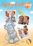 Front of card: Features an illustration of Tatty Teddy on the beach wearing a snorkle mask, holding a net full of shells they have collected. Tatty is surrounded by 3 photo upload frames.