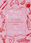 Featuring central handdrawn lettering, surrounded by line drawings of a croissant, pasta, wine bottle, wine glass, flowers in a vase, knife and fork, heart and stars. The illustrations are in red, on a pink background.