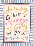 A beautifully illustrated Mother's Day card with a heartfelt message for a special nanny. Featuring hand-drawn typography, soft pastel colours, and a striped border, this card expresses love and appreciation.