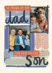 A colourful Father's Day card featuring two photo frames set against a textured, artistic background. With playful brushstrokes and a heartfelt message, this design celebrates a son's journey into fatherhood with pride and love.