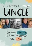Featuring a heartfelt message to an uncle on a blue background that is adorned with abstract blue, green, orange and yellow brush strokes. The words "Lucky" and "you" in the sentence are highlighted in different colours and styles, adding emphasis and a playful touch. In the centre, there are three photo upload areas in a longways photo strip.