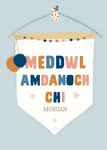 So Wonderful Typographic design featuring a banner with a colourful non editable caption that reads Meddwl Amdanoch Chi, followed by the editable recipient's name. The card background colour is pale blue.