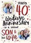 Front of card: Featuring 2 circular photo areas framed by dotted gold borders & hand-lettered black script and shimmering red typography, all on a white background scattered with red heart illustrations.br> Text reads: "Happy 40th wedding anniversary to a brilliant son & his wife."