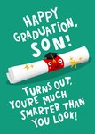Front of card: Featuring an illustration of a rolled diploma certificate with bold white typography on a teal background. Text reads: "Happy graduation, son! Turns out, you're much smarter than you look!".