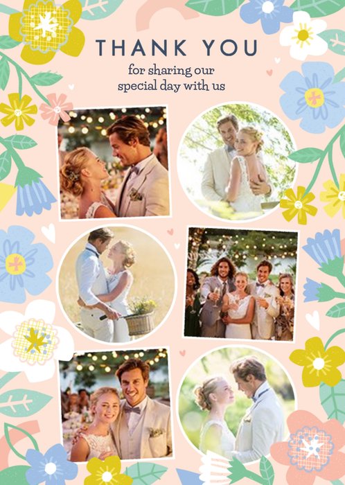 Front of card: Illustrated floral design with six photo upload options on peach background Text reads: "Thank you for sharing our special day with us". Editable text.
