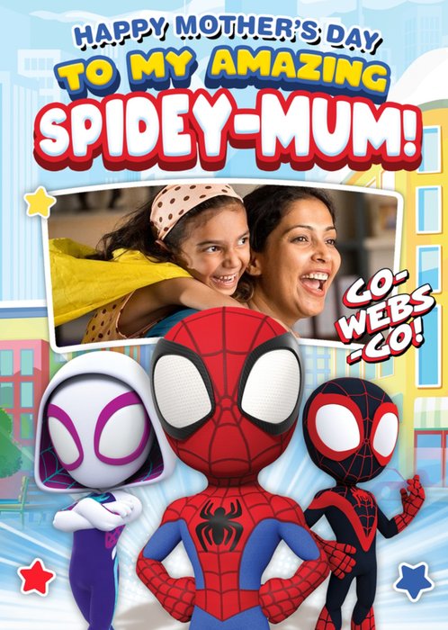 Front of card: Spidey And His Amazing Friends Photo Upload Mother's Day Card Featuring Spidey, Spin and Ghost-Spider. Text reads: "Happy mother's day to my amazing Spidey-mum! Go-webs-go!".