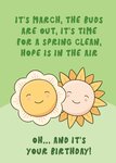 A cheerful birthday card featuring two smiling flowers against a soft green background. The card embraces the joyful essence of spring, with a sweet and playful message about the arrival of March and the promise of renewal. Perfect for anyone celebrating a birthday in the spring season.