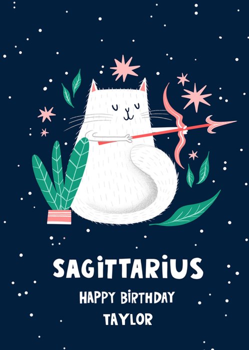 Featuring an illustration of a white cat holding a pink bow and arrow, representing the Sagittarius zodiac sign. The cat is surrounded by green leaves, pink stars, and a navy night-sky background filled with stars.