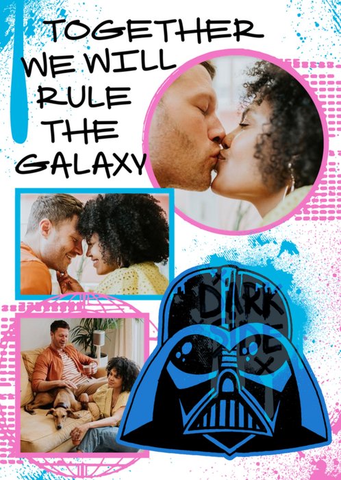 Front of card: There is a close up cute illustration of Yoda holding a Love Heart. On a black background with red hearts and white stars. Below the illustration there is photo upload frame and above the image is white text that reads: "Boyfriend Yoda one for me"