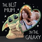 Front of card: Cute Baby Yoda Illustration holding a large heart shaped photo upload on a Black Space theme background with text above and below Above text reads: "The Best Mum" Below text reads: In The Galaxy
