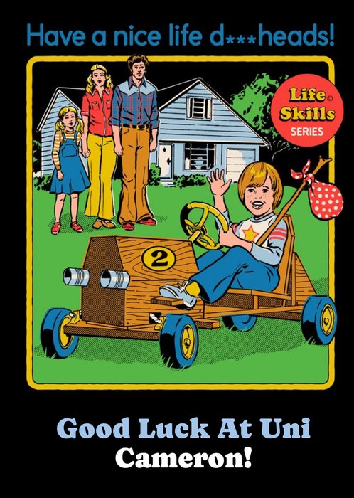 Text reads "Have a nice life d***heads! Good luck at uni Cameron!".