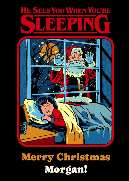 Front of card: Featuring a retro illustration of Santa peering through a child's window. Text reads: "He sees you when your sleeping merry Christmas Morgan". 'Merry Christmas Morgan' can be personalised!