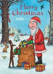 Stick Man and Santa in the woods putting presents in a sack. Text reads: "Merry Christmas Alfie" Alfie is customisable.