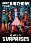 This Stranger Things greeting card features the main characters in a bold, comic-book style, posed and ready for action in a dark forest with a Demogorgon looming behind, all set against a moody blue-to-red background.