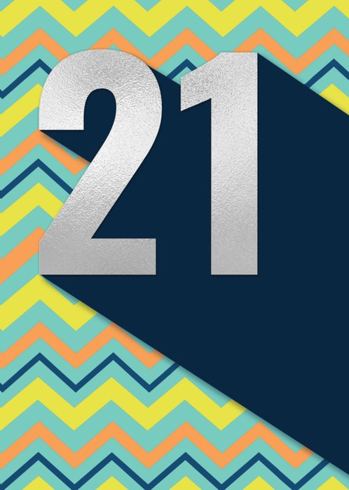 Featuring a large silver metallic number 21 with a long navy drop shadow, & a colourful zigzag chevron pattern in yellow, turquoise, orange, and blue.