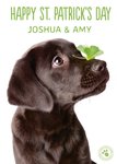 Front of card: Studio Pets Puppy Happy St Patrick's Day Card Features a chocolate Labrador with a Four Leaf Clover on it's nose. Text reads: "Happy St Patrick's Day Joshua & Amy.