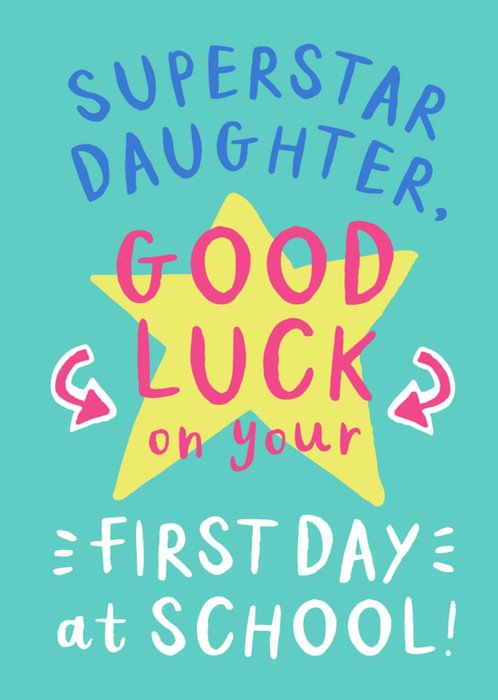A playful design featuring a yellow star with bold hand-lettered wording and pink arrow doodles on a teal background.