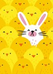Featuring a bright and bold illustration of a white bunny rabbit among lots of Easter chicks.