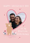 Front of card: A warm and adoring Valentine's Day card featuring a hand-drawn Illustration of a cute bear. There is a photo upload area inside a heart-shaped frame in the centre of the design, the bear appears to be holding up the frame. There are also little love hearts in the background.