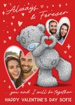 This Tatty Teddy Valentine’s Day card features a red background with a large illustration of the iconic grey Tatty Teddy bear holding a heart shape, surrounded by scattered hearts and stars. Two heart-shaped photo upload areas are located to the left and right of the teddy bear, with the one on the left positioned towards the bottom and the one on the right positioned towards the top. The card includes romantic text that reads: “Always & Forever… you and I will be together. Happy Valentine’s Day Sofie.”