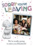 Me To You Tatty Teddy design featuring a colourful non editable caption that reads Sorry You're Leaving, followed by the non editable We're Really Go To Miss You Recipient's Name. Tatty Teddy is holding a frame for the photo upload option. The card background colour is white, with different multi coloured spots scattered about.