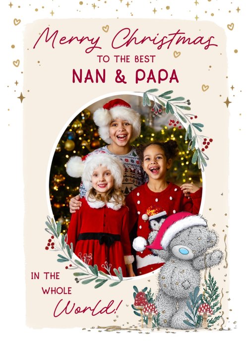 Featuring the Me To You Tatty Teddy in a Santa hat holding a string of gold decorations beside a large circular photo upload frame. The background is a soft cream shade decorated with gold stars, hearts, holly, berries and whimsical toadstools. Hand-lettered festive text appears above and below the photo.