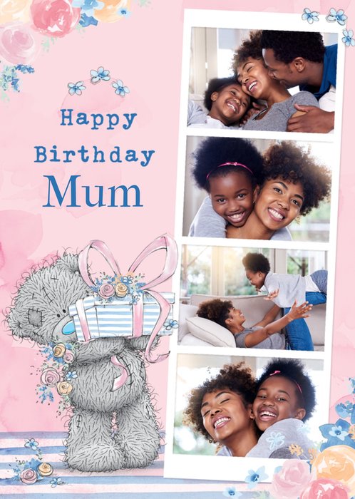Front of card: Featuring a cute illustration of Tatty Teddy with a present and four photo frames. Text reads: "Happy birthday mum". 'Mum' can be personalised!
