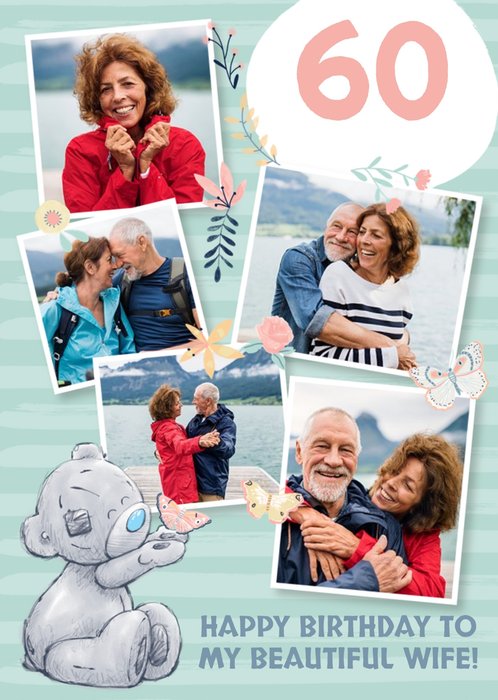 Featuring a Tatty Teddy illustration with pastel balloons, bunting, wrapped gifts and wildflowers, plus a central circular photo frame, on a soft pink coloured background.