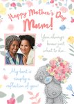 Front of card: Tatty Teddy Photo Upload Mother's Day Card Illustration of Tatty Teddy with a bunch of flowers and a photo frame. Text reads: "Happy Mother's Day mum! You always knew just what to do... My best is simply a reflection of you!".