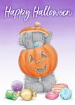 Features an Illustration of Tatty Teddy inside a carved out pumpkin, surrounded by large sweets.