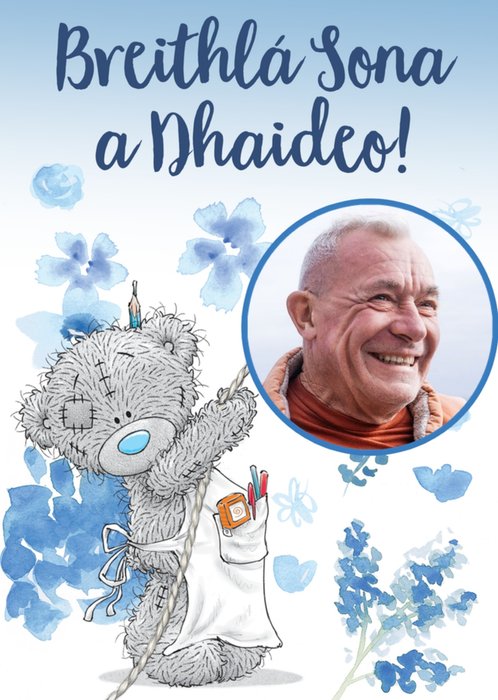 Front of card: Tatty Teddy is on a blue watercolour background and is wearing an apron and has a pen behind his ear. There is a photo upload circle to the right of Tatty Teddy.