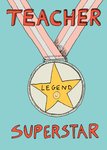 Illustrated card with a playful, hand-drawn style showing a medal on a red and white ribbon, featuring a yellow star with a smiley face in the centre. Set against a bright blue background, ideal for expressing gratitude to a standout teacher.