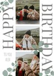 Sweet and tender Birthday Photo Upload Card featuring three photo upload areas with eucalyptus foliage overlapping the frames.
