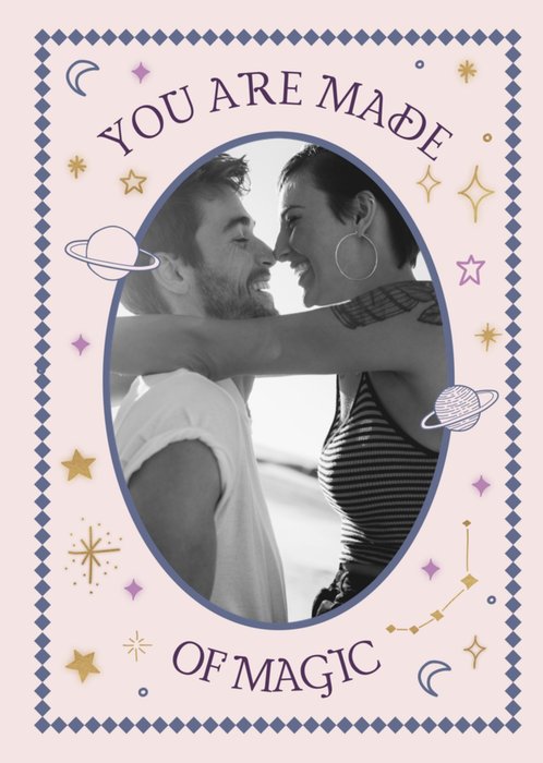 Front of card: A magical and mystical Photo Upload Birthday card featuring hand-drawn illustrated stars, a crescent moon and planets surrounding one photo upload area inside of an oval picture frame.