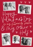 A warmhearted and loving Valentine's Day card featuring five photo upload areas in frames in a collage, two of the frames look like postage stamps, and one of the frames is held on with sticky tape. The text on this card is script-style, hand-written in pencil.