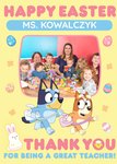Front of card: Featuring an illustration of Bluey and Bingo surrounded by easter eggs on a yellow background. Text reads: "Happy Easter Ms. Kowalczyk thank you for being a great teacher". 'Ms. Kowalczyk' can be personalised!