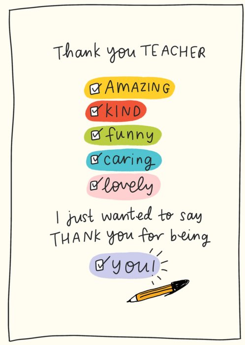 A cheerful and colourful greeting card for a teacher with hand-drawn text and tick boxes listing warm compliments, ending with a final message and pencil doodle on a light cream background.