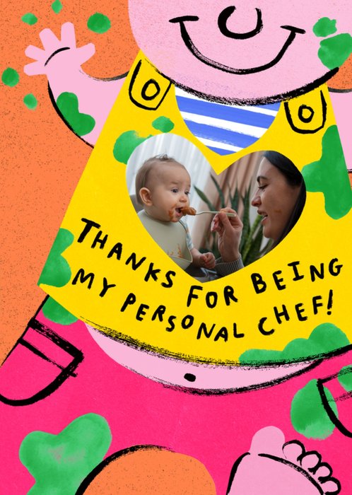 A fun and colourful Mother's Day greeting card featuring a playful baby bib illustration with a heart-shaped photo upload area, celebrating a mum’s dedication to feeding her child.